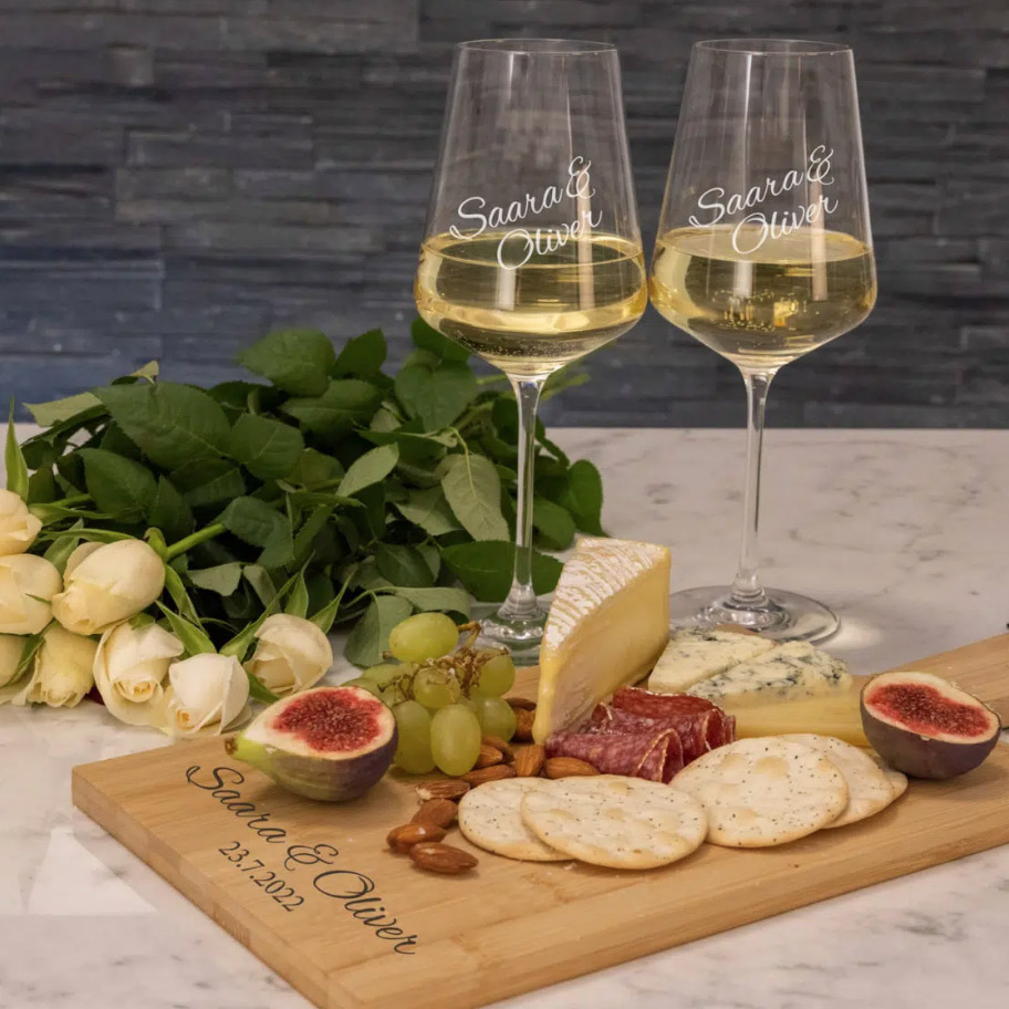 2 white wine glasses and a serving plate